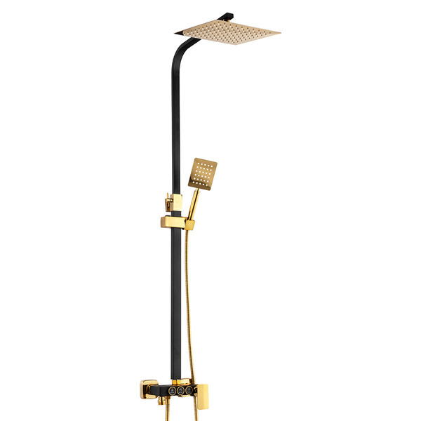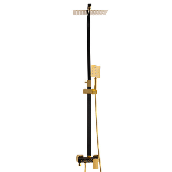 Nástenná sprchová súprava vo verzii Premium, ktorá sa vyznačuje najvyššou kvalitou výroby. Batéria je vyrobená z mosadze, pokrytá čiernym matom a lesklým zlatom. Keramická hlavica je zárukou bezporuchovej prevádzky na dlhý čas. Batéria s dažďovou sprchou je navrhnutá v modernom štýle.