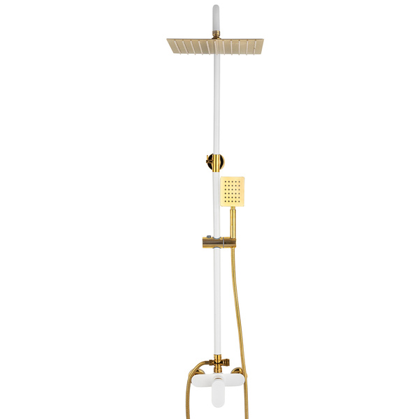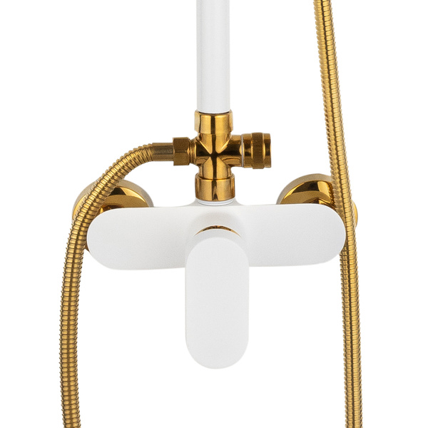 Nástenná sprchová súprava vo verzii Premium, ktorá sa vyznačuje najvyššou kvalitou výroby. Batéria je vyrobená z mosadze, pokrytá bielou glazúrou a lesklým zlatom. Keramická hlavica je zárukou bezporuchovej prevádzky na dlhý čas. Batéria s dažďovou sprchou je navrhnutá v modernom štýle.