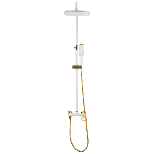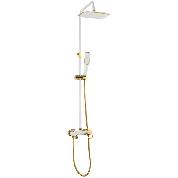 Nástenná sprchová súprava v prémiovej verzii, ktorá sa vyznačuje najvyššou kvalitou výroby. Batéria je vyrobená z mosadze, pokrytá bielou emailou a lesklým zlatom. Keramická hlavica je zárukou bezporuchovej prevádzky na dlhý čas. Batéria s dažďovou sprchou je navrhnutá v modernom štýle.