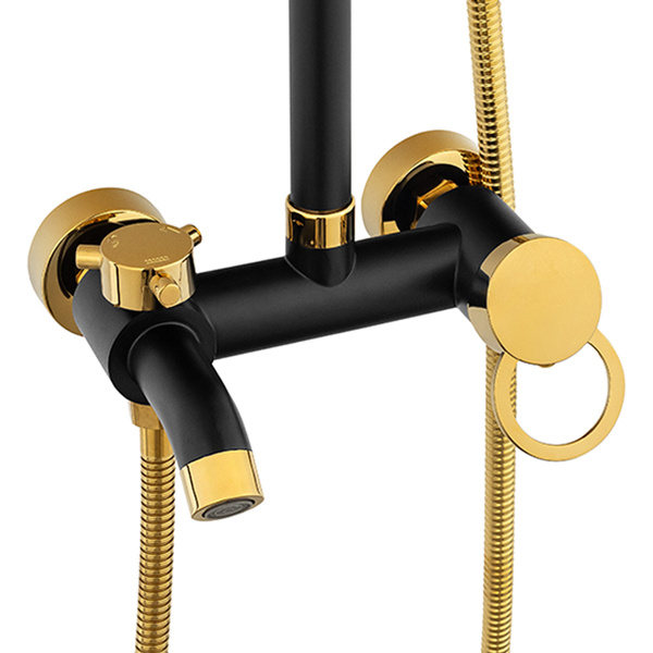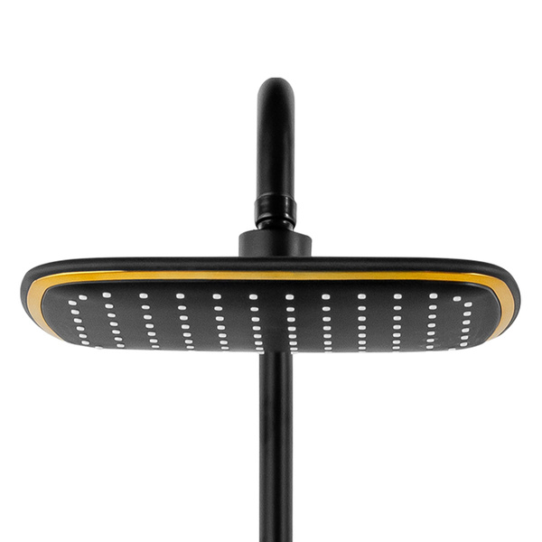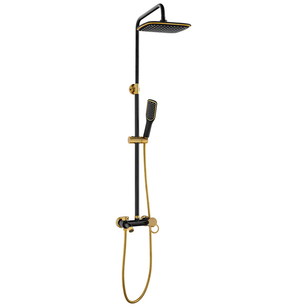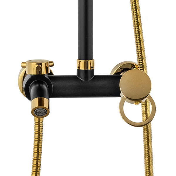 Nástenná sprchová súprava vo verzii Premium, ktorá sa vyznačuje najvyššou kvalitou výroby. Batéria je vyrobená z mosadze, pokrytá čiernym matom a lesklým zlatom. Keramická hlavica je zárukou bezporuchovej prevádzky na dlhý čas. Batéria s dažďovou sprchou je navrhnutá v modernom štýle.