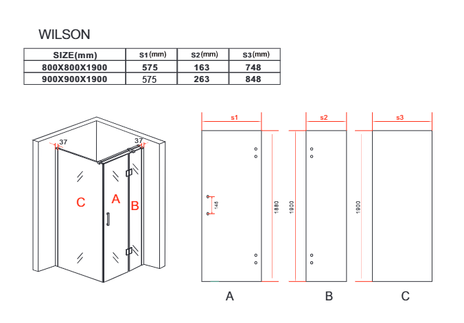SPRCHOVÝ KÚT WILSON ŠTVORCOVÝ TRANSPARENTNÝ - 80X80X190 ČIERNY