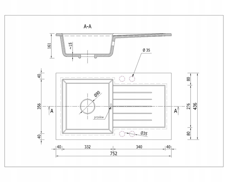 Komora: 335 x 355 mm, hĺbka 165 mm. Široký, ryhovaný odkvapkávač uľahčuje sušenie väčšieho množstva riadu. V balení jednokomorový manuálny sifón v chrómovej farbe s možnosťou pripojenia umývačky alebo práčky.