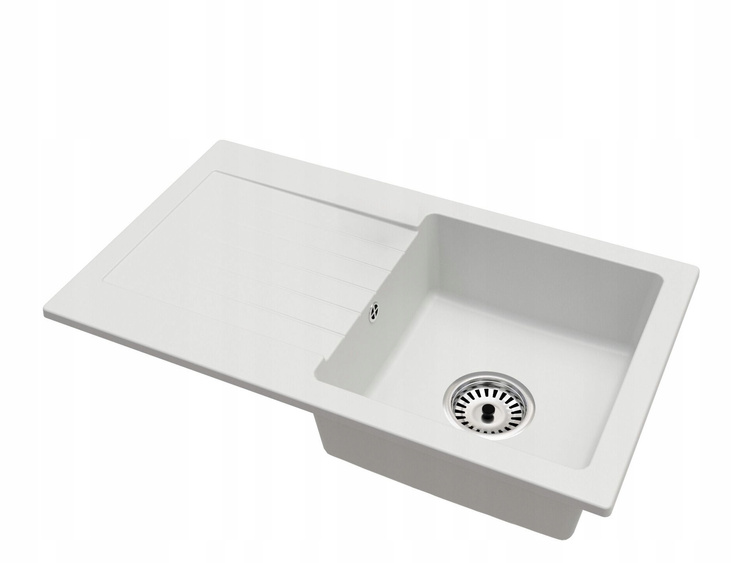 Granitový drez Leon v odtieni čistej bielej je ideálnou voľbou do moderných, škandinávskych alebo klasických interiérov. Svetlá farba sa perfektne kombinuje s dreveným, sivým alebo farebným nábytkom a dodáva kuchyni sviežosť a eleganciu. Kuchynský drez Leon zaujme funkčnosťou – má širokú odkvapovú plochu na pravej strane a praktickú poličku so štyrmi bodmi na montážne otvory (vŕtané na želanie zákazníka).
