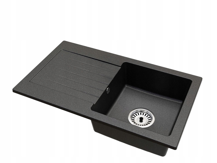 Granitový drez Leon v odtieni čiernej s jemným bodkovaným efektom je ideálnou voľbou do moderných, industriálnych alebo klasických interiérov. Dekoratívny nakrapaný povrch dodáva kuchyni originálny charakter a štýlový vzhľad. Kuchynský drez Leon zaujme funkčnosťou – má širokú odkvapovú plochu na pravej strane a praktickú poličku so štyrmi bodmi na montážne otvory (vŕtané na želanie zákazníka).