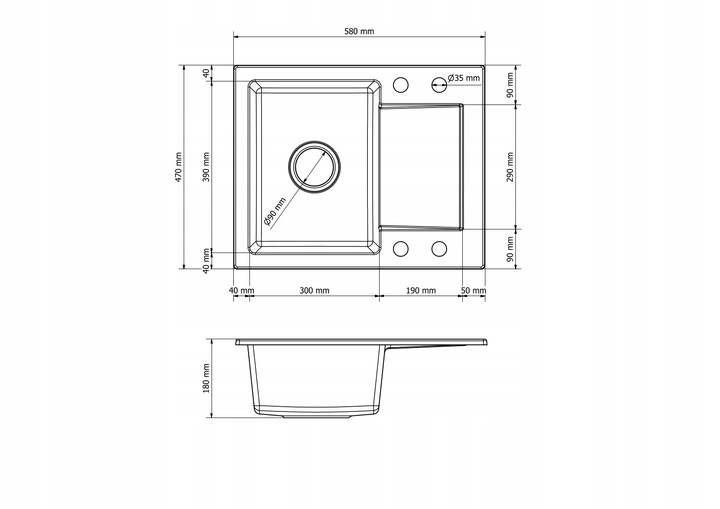 Rozmery: 580 × 470 mm, komora 390 × 300 mm, hĺbka 180 mm. Súčasťou je jednokomorový manuálny sifón v chrómovej farbe s možnosťou pripojenia práčky alebo umývačky.